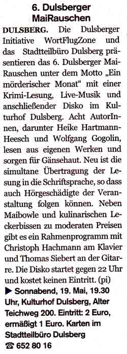 Freitag, 13. Mai 2016 um 20 Uhr: Lesung 'Mairauschen' im Kulturhof Alter Teichweg 200 Es lesen unter dem Motto 'Katze von links' u.a. Tanja Fürstenberg, Rüdiger Ries, Karsten Meyer und Wolfgang A. Gogolin. Unter dem gleichen Titel wird am Leseabend auch ein Taschenbuch erhältlich sein. Eintritt: 2,50 €
