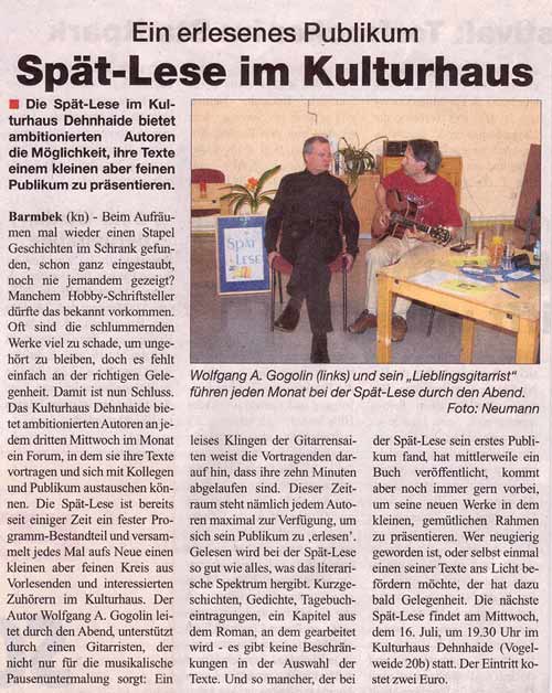 Lesungen / Veranstaltungen'Tattoo aus der Tube' lautete das Mairauschen-Motto 2025,das Wolfgang A. Gogolin mit seinen Autorenkollegen feinsinnig beleuchtete. Kulturhof Hamburg-Dulsberg Alter Teichweg 200 Termin: Freitag, 23.Mai 2025 um 19:30 Uhr Eintritt: 4,-